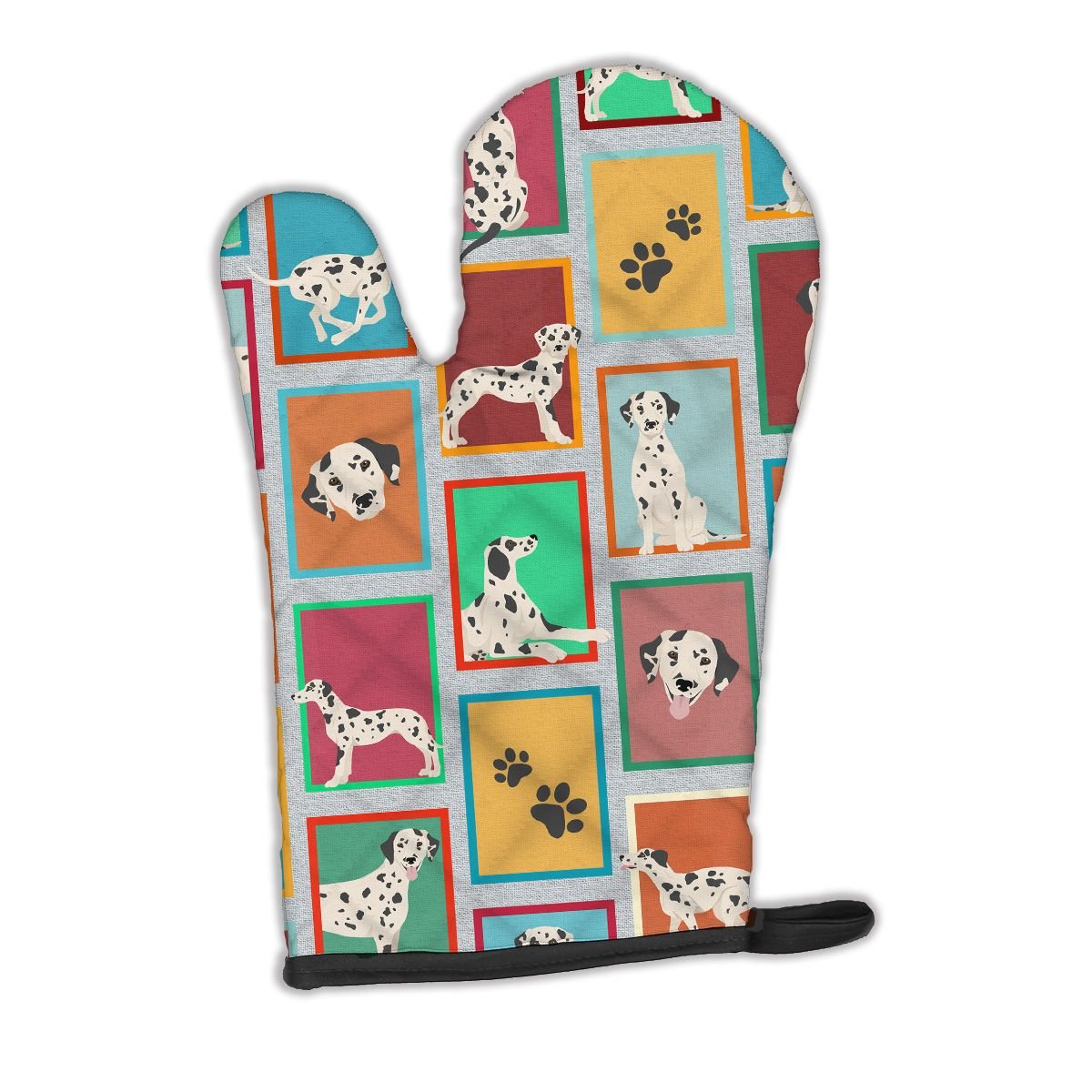 Oven Mitt featuring breed specific Dalmatian artwork. Presenting our Large Right Hand Thick Heat Resistant Oven Mitt, an indispensable tool for any culinary enthusiast. This mitt boasts layers of quilted protection on both sides, providing outstanding resistance against extreme heat. Embellished with beautifully printed artwork, it adds an extra dash of charm to your kitchen decor. At about 12 inches long and 8 1/2 inches wide, this oven mitt offers a generous fit, accommodating a diverse range of hand sizes. Its design is enhanced by a sleek Black bias tape trim, finished with a convenient hoop for easy hanging. Fresh out of the packaging, the quilting process may give the mitt a stiff feel, but rest assured, it will soften with use and washing. Our mitt is crafted with a unique center fabric, Insul-Bright, a composite material made from polyester fibers, needle-punched through a nonwoven substrate and a reflective metallized film. This smart material resists both conduction and radiant energy, reflecting heat back to its source, all while remaining breathable. Our oven mitt is machine washable and safe for tumble drying. It's a perfect gift for your favorite Chef, BBQ enthusiast, or just a little treat for yourself! Experience safety, style, and convenience rolled into one with this exceptional oven mitt.