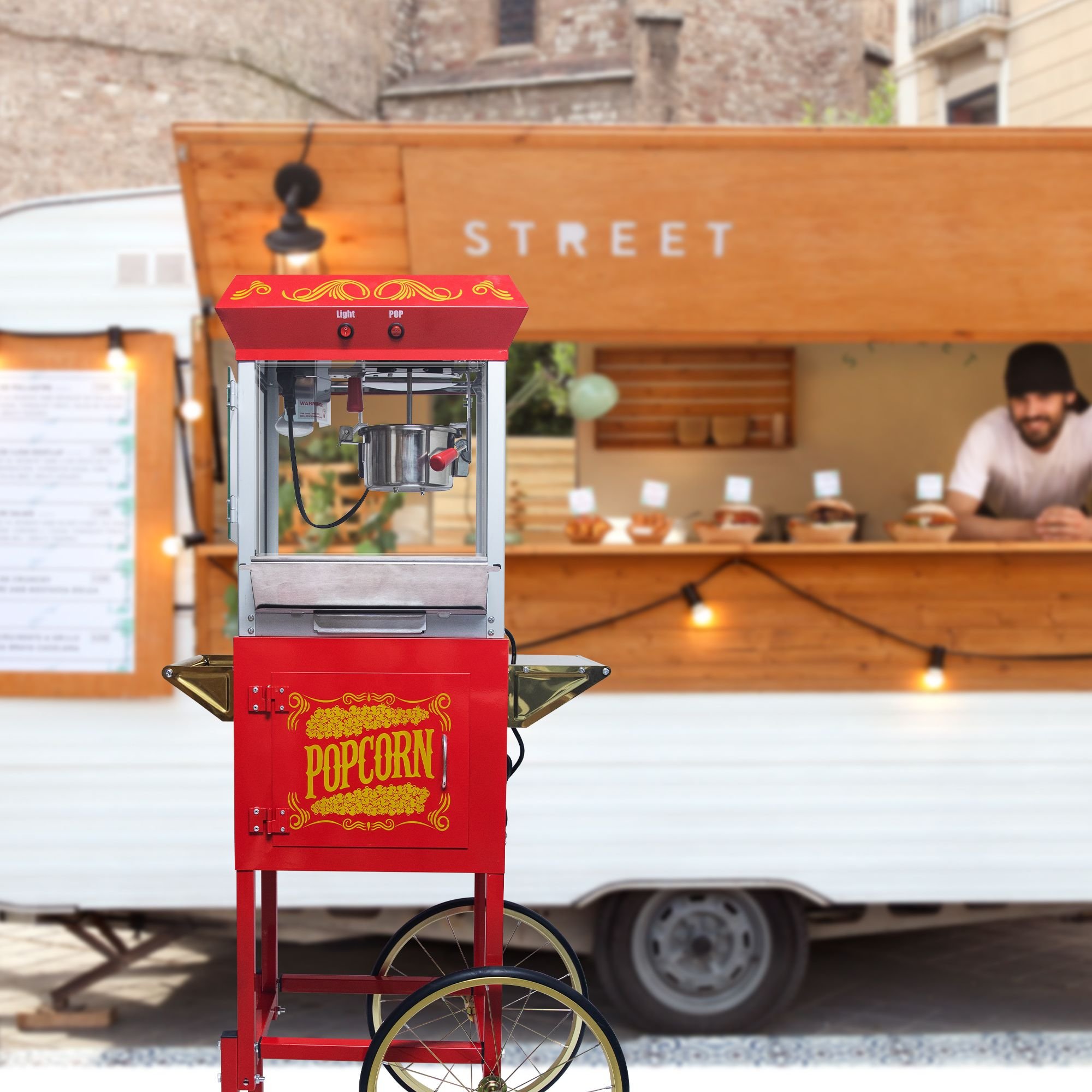 Product Details:Materials: Metal, stainless steel, and tempered glass. Dimensions: (L) 17.1" x (W) 14.1" x (H) 56.5". Power: 650 Watts, 120V.Included Accessories: 3 plastic serving cups, 25 popcorn bags, measuring cups, and a scoop.Assembly: Minor assembly is required.Color: Red. This popcorn machine is not only a practical addition to your kitchen but also a stylish piece that adds a pop of color and a touch of nostalgia to your decor.