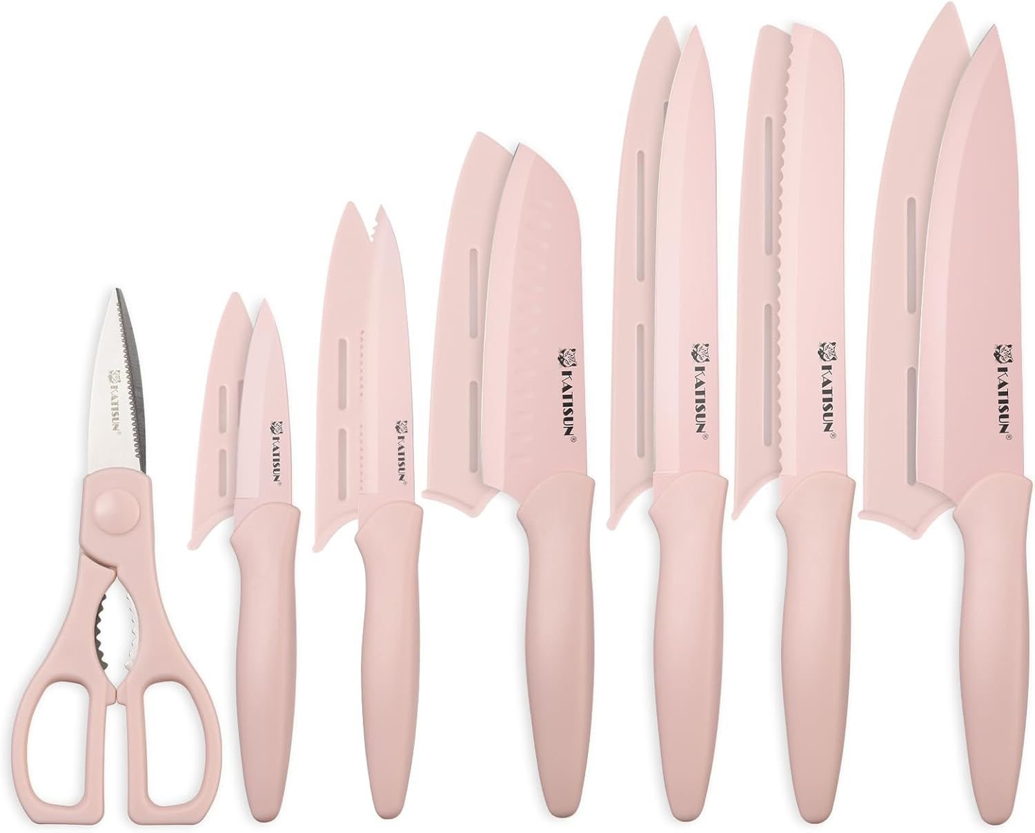 Kitchen Knife Set with Guards, 13 Piece Pink Non-Stick Paint Boxed Knives Set, Anti-Rust and Dishwasher Safe