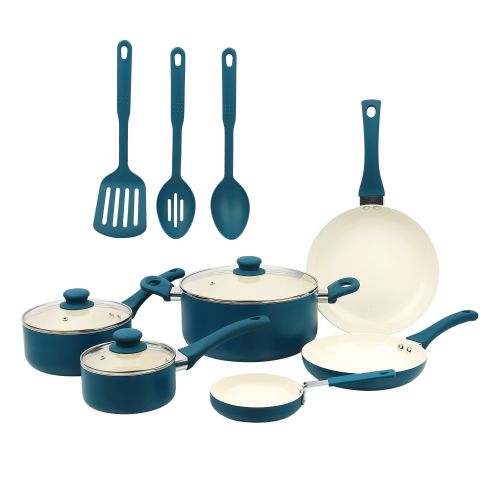 Ideal for everyday use at home, this  ceramic 12 pieces set corsair includes pans and kitchen utensils that can fulfill your everyday cooking needs at home. It is also ideal as a considerate and valuable gift to your close friends and family. The interior is coated with 2 layers of PPG Customized ceramic coating, which makes cooking and clean-up easy. The pans heat quickly and evenly due to the aluminum body, so this set will help you save time cooking as well. Cool, soft-touch handles provide a comfortable grip., while the outside color of this set will offer a bright pop of color to your kitchen.