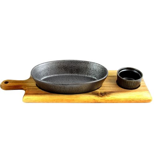 Set includes : one oval bowl (8x5x1.75 - 0.42 lbs), one dip bowl (2.75x2.75x1.25 - 0.08 lbs) and one wooden paddle (15.5x5.5x.75 - 0.42 lbs)