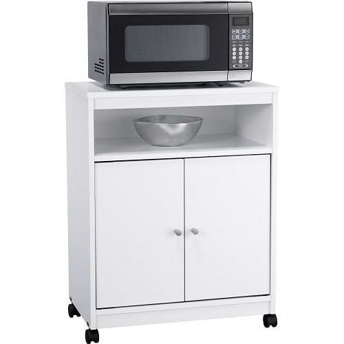 Dinner prep and kitchen storage just got easier, thanks to this White Utility Cart / Kitchen Microwave Cart with Casters. Perfect in any kitchen, the cart is a kitchen utility unit that offers space for your microwave and many other items. Two cabinet doors open to a large storage area, ideal for keeping cereals, snacks, chips, bottled water and other foods. Or, use it to conceal your various serveware, plastic containers, lids and other items that usually clutter your countertops. An additional open compartment above the doors is perfect for placing bowls, cups and more. The kitchen utility cart is on wheels, making it easy to move around your space. Simply roll it out when you need and place it back against a wall when you're done. The cart is designed in a crisp white finish with solid metal handles, making it an attractive addition to any home. Easy to assemble with household tools.