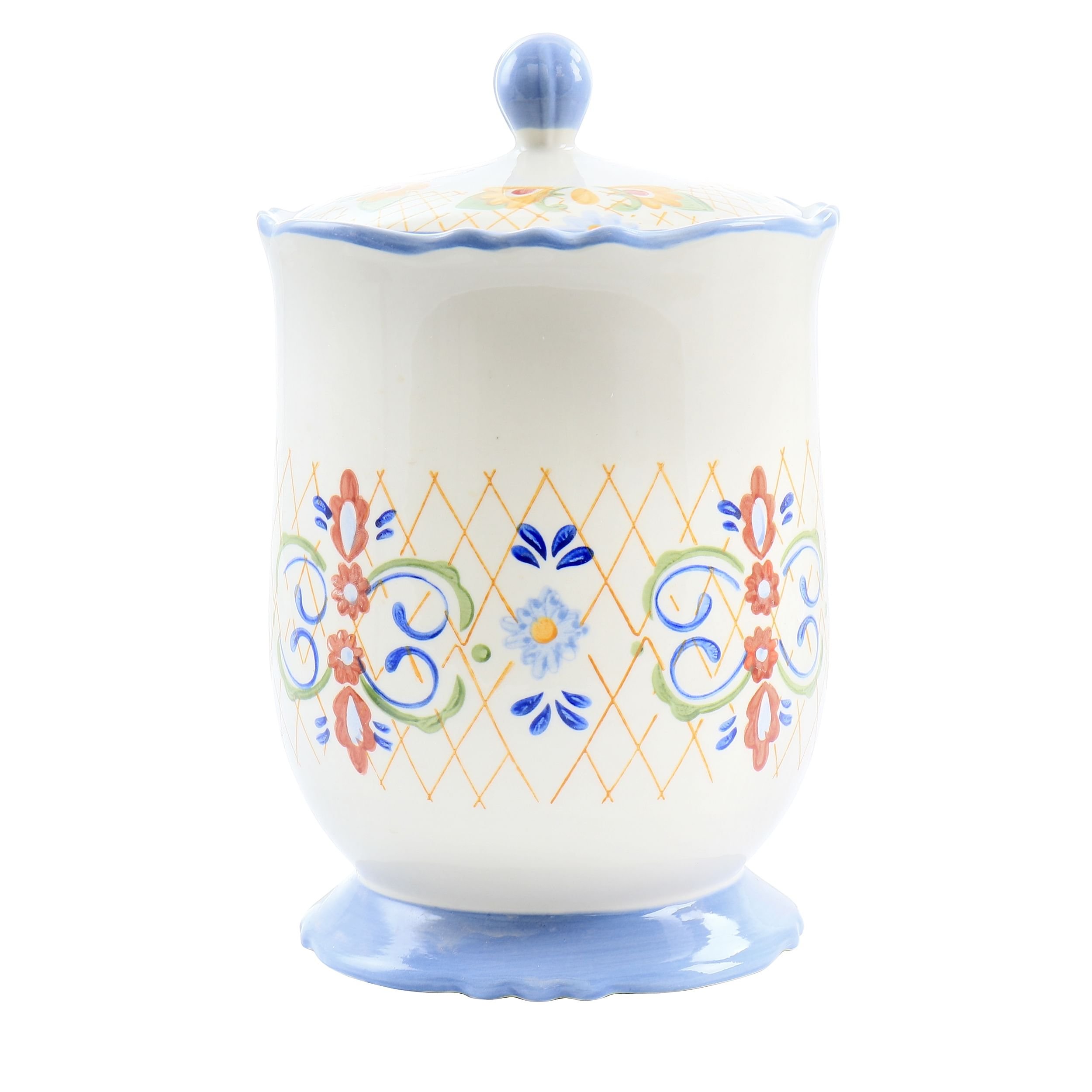 The Laurie Gates California Designs Tierra 2.7 Quarts Hand Painted Stoneware Canister with Lid is a comforting accessory to any home kitchen counter. This food storage container features a hand painted flora country side design around the body along with a dusty cornflower blue accent. The stoneware body and silicone ring help keep any stored goodies fresh and ready for a quick bites. For long lasting quality and care, only hand wash the canister and lid. Store freshly baked cookies, grains, sugars or sweet treats!