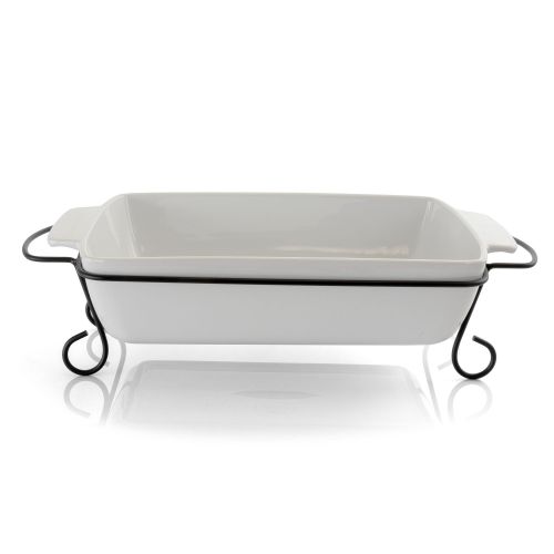 The Gibson Elite 2 piece 15.5 inch stoneware bakeware with metal rack really puts the feast together. This 2 piece serving set features a rectangle bakeware container made of stoneware. Its oven safe so you can cooking and directly bring it from the oven to the dinning table. Display your wonderful meal with the matte black metal rack that keeps the heat away from the table's surface. Serve just about anything you can think of, from peach cobblers and apple strudels to baked tilapia and stuffed chicken breasts. Perfect for any large gatherings, use it to display a side dish or show off the main course!