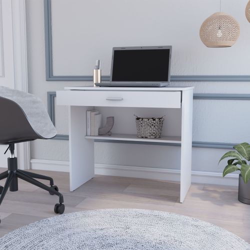 Kaylor Storage Desk"Streamline your workspace with the Kaylor Storage Desk, a chic and compact solution for any study or office area. With dimensions of 31.5""W x 19.6""D, its surface offers ample room for work essentials. The desk features a conveniently sized drawer (27.8""W x 3""H) for your supplies and a lower shelf (27.8""W x 7.4""D) for extra storage. Its unique black or white manufactured wood finish brings a touch of modern sophistication.Dimensions:Height: 29'Width: 31,5'Depth: 19,6'
